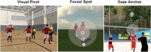 “Peripheral vision can be used to monitor players in the periphery, process motion-related information of other players or the ball, and to select the location of the next fixation….Pursing gaze-anchoring strategies is generally advisable in order to optimally exploit peripherally available information.”  Where you rest your eyes when you don’t yet know what will happen or where you’ll need to focus is also very very important.