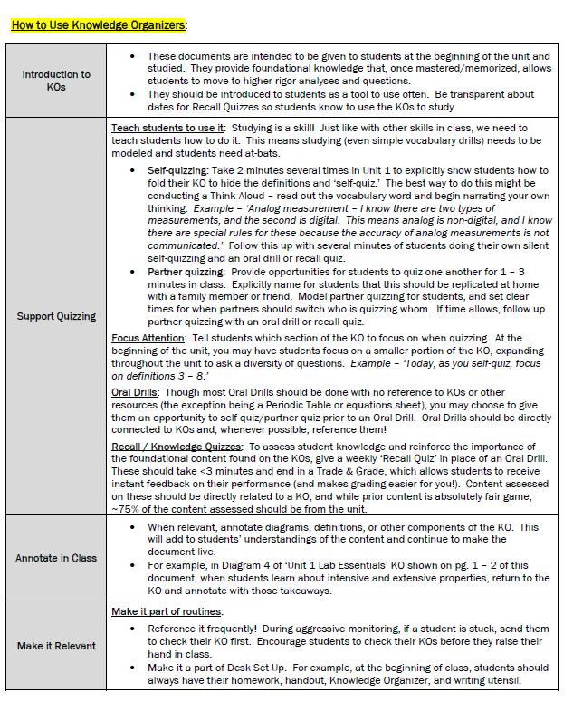 Sadie McCleary, Chemistry Teacher extraordinaire and Science Department Lead at Uncommon Collegiate Charter High School, is a good friend of Team TLAC. She’s a TLAC Fellow and constantly keeps in touch to share ideas she’s adapting and developing. And she has a special interest in Knowledge Organizers. This year she’s been trying to support other teachers in designing and implementing them effectively. She put together a quick guide that we (i.e. Team TLAC) think is pretty tremendous.