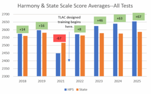 In the 2023-2024 School Year we were not working directly with Harmony and they had their highest performance to date: 2639 scale score average across all state tests, outperforming the scale score state average by 63. In 2024-2025, Harmony secured a new grant that enabled us to collaborate for one additional year and improvement continued: 2654 scale score average across all state tests, outperforming the state average by 67.